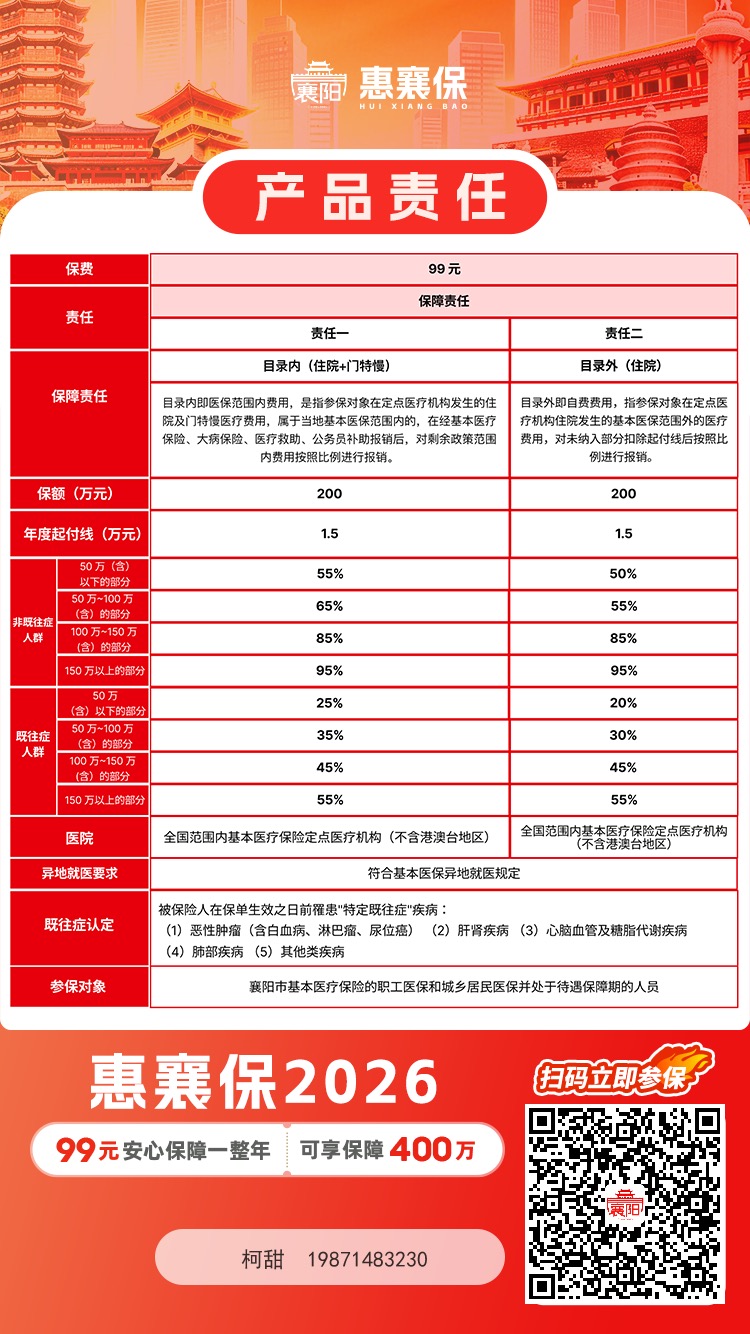 【商家推广】政府指导, 每份99元,保额400万,真正的惠民保险[强][强]可以带病投保,只要办理有襄阳医保(职工医保、居民医保、农合)均可投保。识别下面二维码可以直接投保